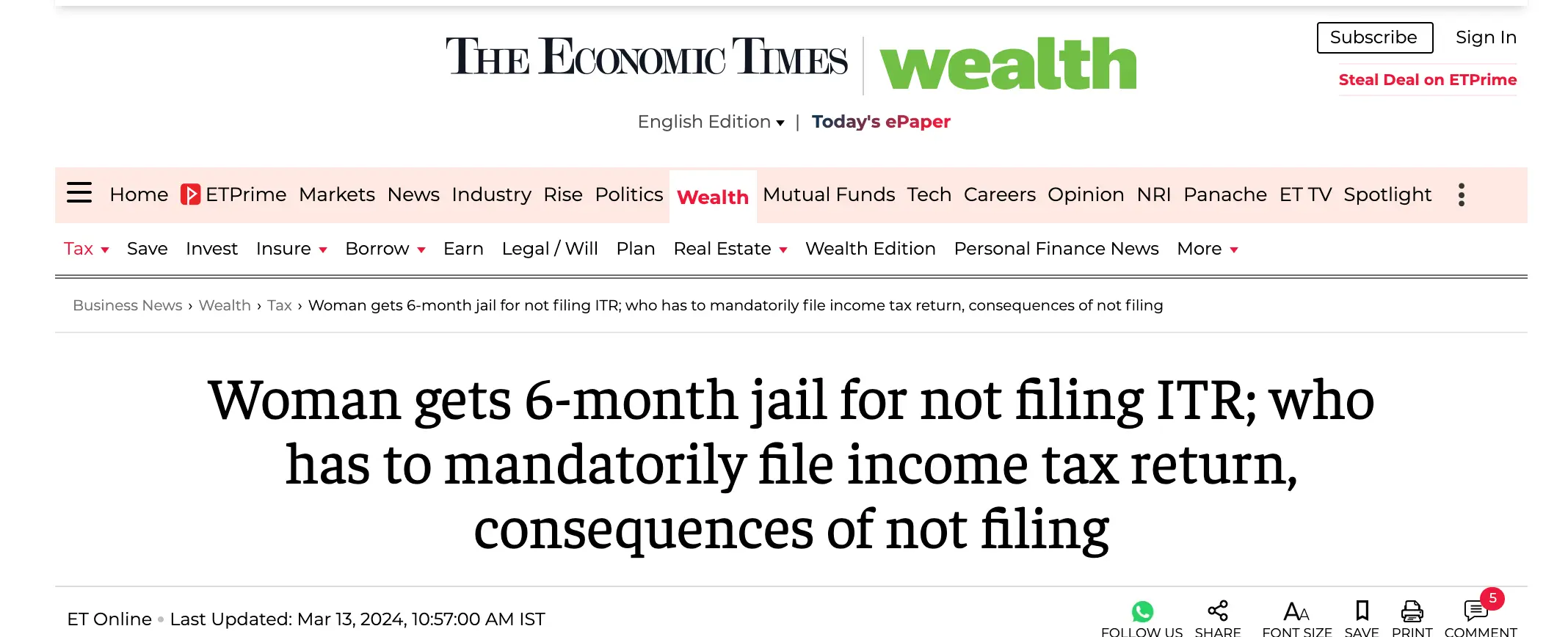 कुछ दिन पहले दिल्ली में एक महिला को 6 महीने की जेल की सजा इसलिए हुयी है क्योकि उसने ITR नहीं भरा है और इसके साथ साथ जुर्माना भी लगा है लेकिन आपके एरिया में बहुत ऐसे लोग होंगे जो ITR नहीं भरते होंगे ऐसे में आप जरूर सोचते होंगे की ITR फाइल जो लोग नहीं करते है उन्हें क्या होगा ? तो चलिए समझते है।
